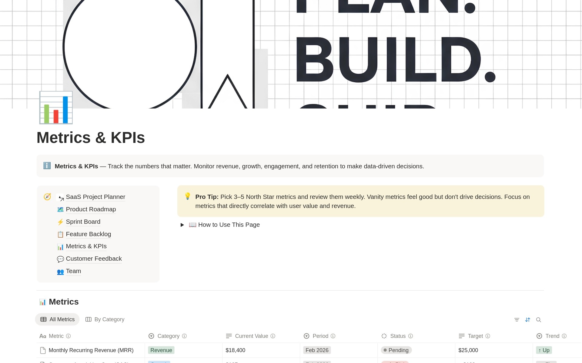 Metrics & KPIs A system for managing by numbers. It tracks saas revenue projections, MRR, churn, and CAC. Each metric has a target and a “health” status like “At Risk” or “On Track.” Trend indicators (↑ / ↓) provide a quick scan of growth or retention.