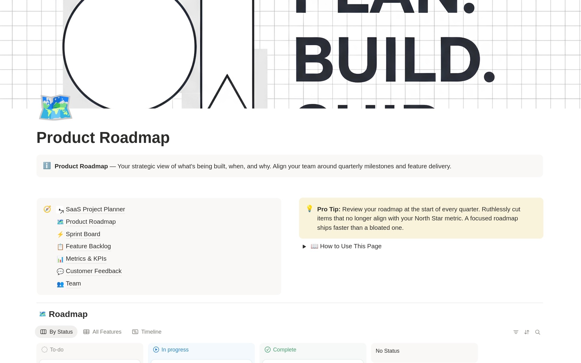 The SaaS Project Planner is a Notion template designed for end-to-end product management. It covers several key areas:
